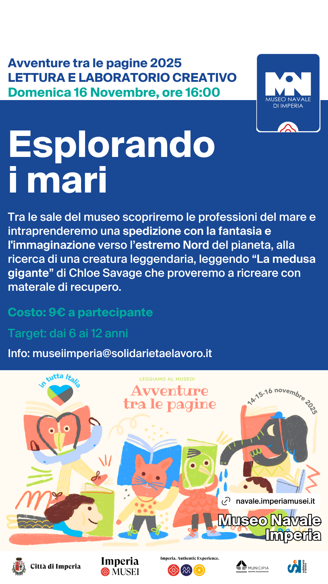 In occasione della rassegna "Avventure tra le pagine - Leggiamo al museo", Domenica 16 Novembre alle ore 16:00, il Museo Navale ospiterà l'attività laboratoriale "Esplorando i mari".