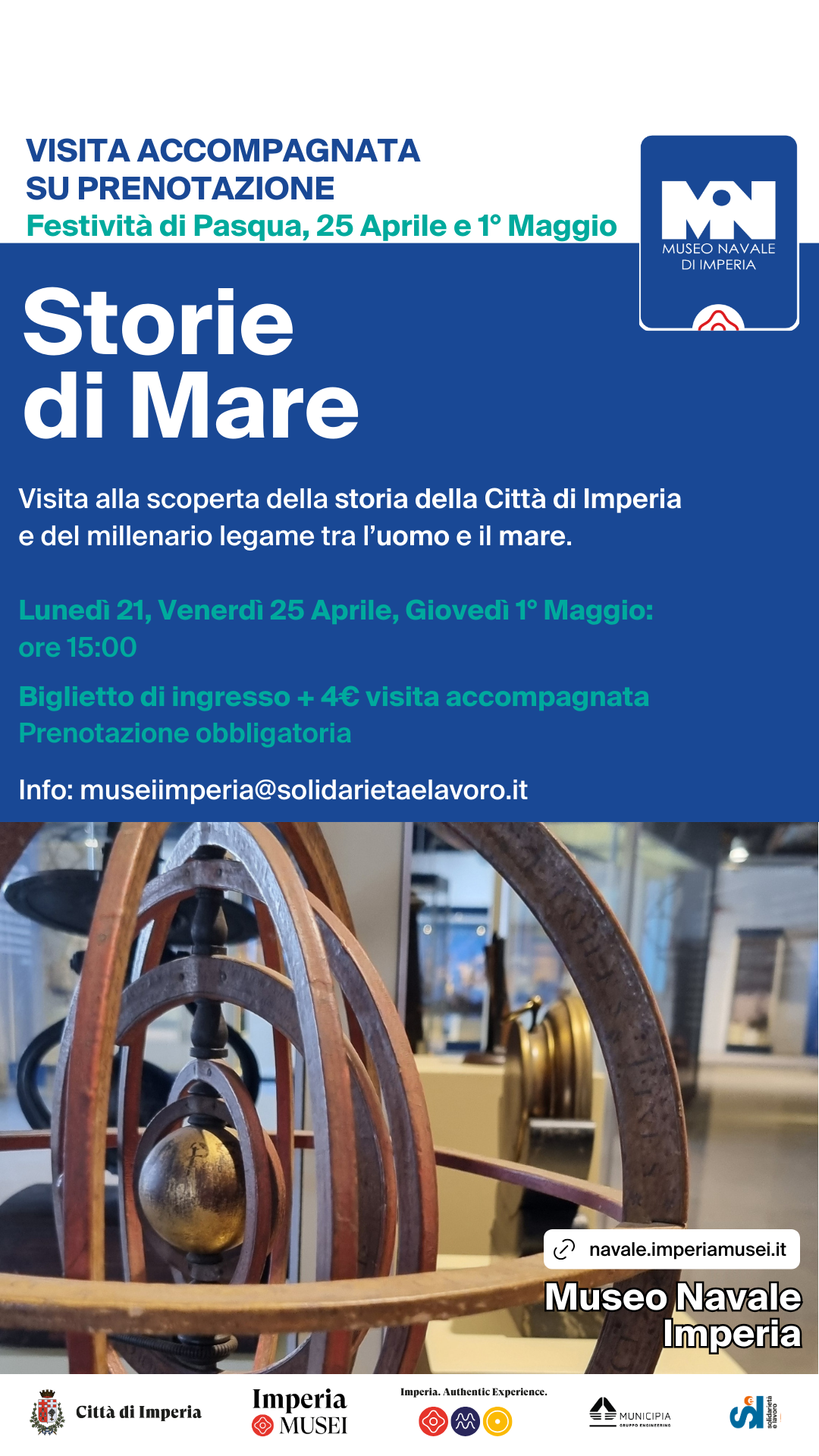 Festeggiamo Pasquetta lunedì 21 aprile, il 25 aprile e il 1°maggio alle ore 15:00 con la visita accompagnata “Storie di Mare”, un affascinante percorso alla scoperta della storia della città di Imperia, in stretta connessione con quella della navigazione, per raccontare il rapporto millenario tra l’uomo e il mare. Attraverso le sale espositive disposte su due piani, si rivivrà la memoria della tradizione marinara locale, ma anche un passato glorioso che va dalla navigazione in epoca colombiana all’epopea di Capo Horn, fino alle grandi esplorazioni geografiche che segnarono la storia del mondo.