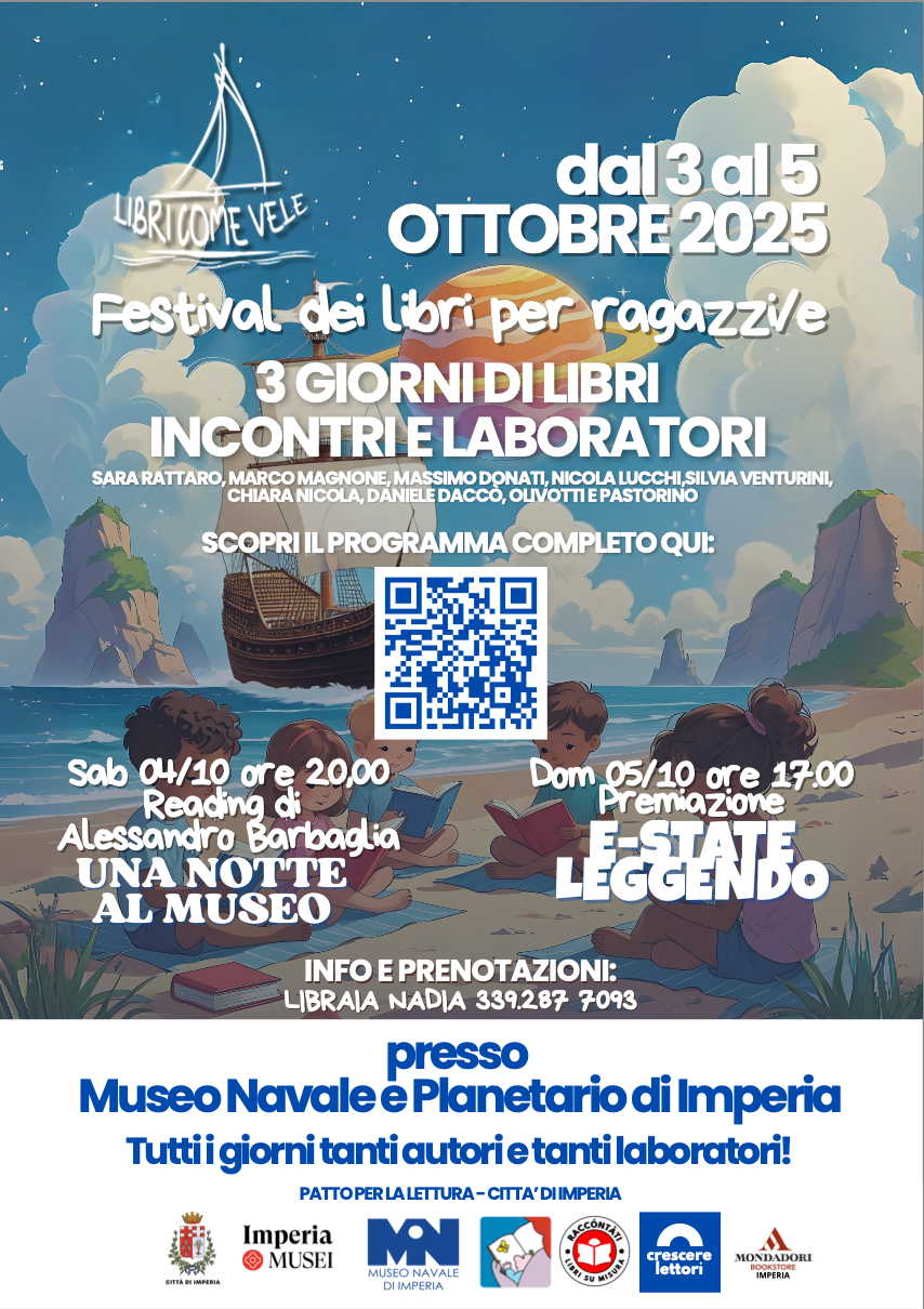 Il 3, 4 e 5 ottobre 2025 Imperia ospiterà la prima edizione di “Libri come Vele”, il nuovo Festival di letteratura per ragazzi che animerà il Museo Navale e il Planetario con tre giornate dedicate alla lettura, all’immaginazione e alla scoperta.