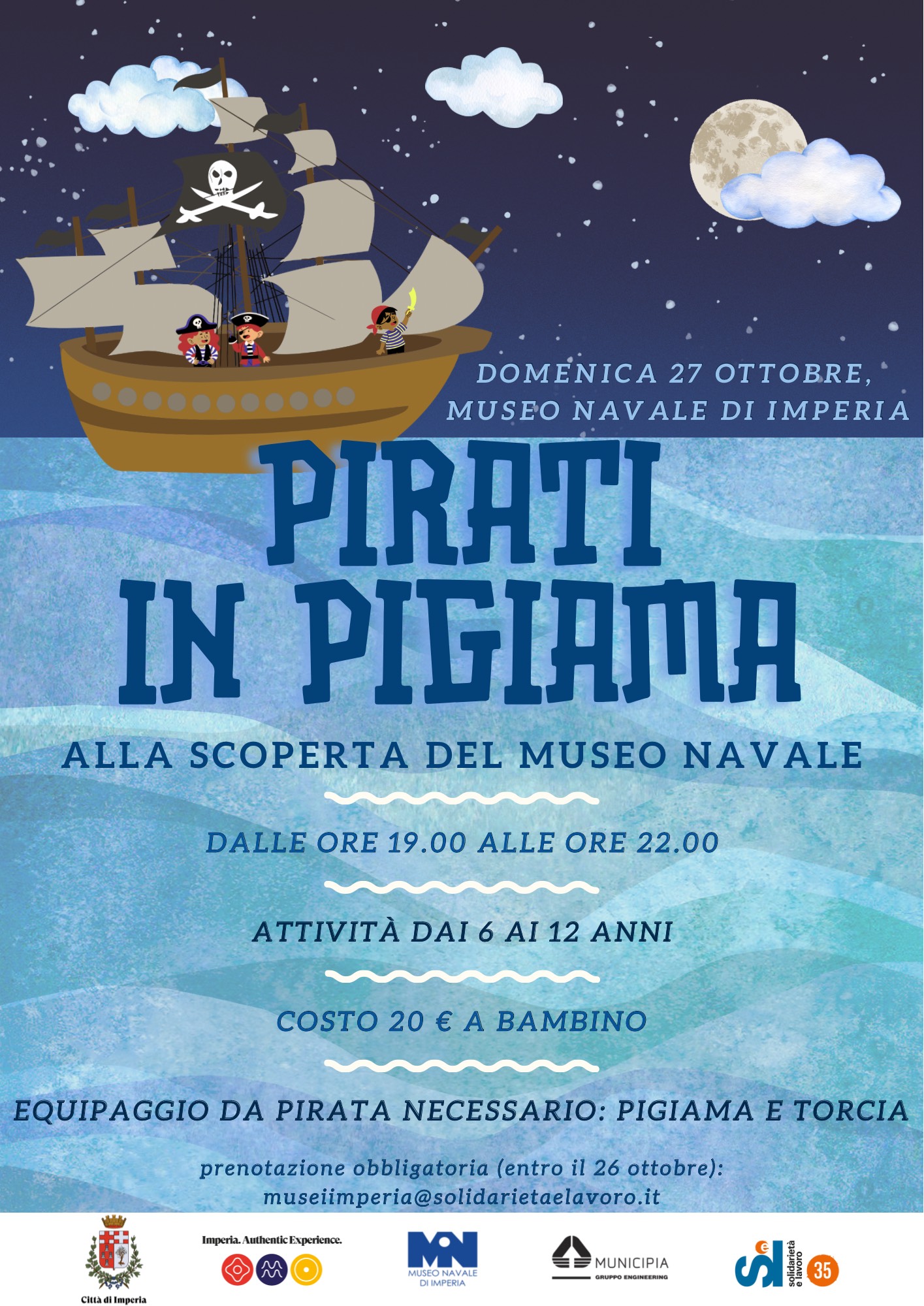II giovani pirati verranno accolti dal Pirata Kurtz e dai suoi aiutanti, per vivere una serata emozionante e in compagnia. Dopo aver assaporato una gustosa pizza, saranno coinvolti in attività laboratoriali e nella visita del museo Navale di Imperia, tra reperti, modellini e storie da raccontare.