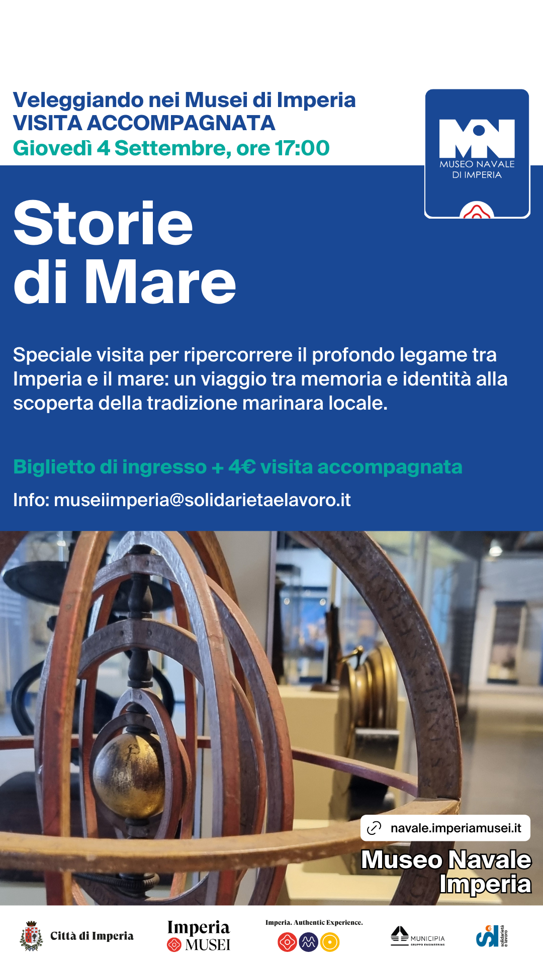 Giovedì 4 settembre alle ore 17:00 si terrà la visita accompagnata "Storie di mare": un'occasione per ripercorrere il profondo legame tra Imperia e il mare: un viaggio tra memoria e identità alla scoperta della tradizione marinara locale. Un percorso tra reperti, cimeli e strumenti nautici che racconta la storia della navigazione, dalle esplorazioni geografiche al passaggio per Capo Horn, fino alla vita quotidiana dei protagonisti che hanno solcato i mari.