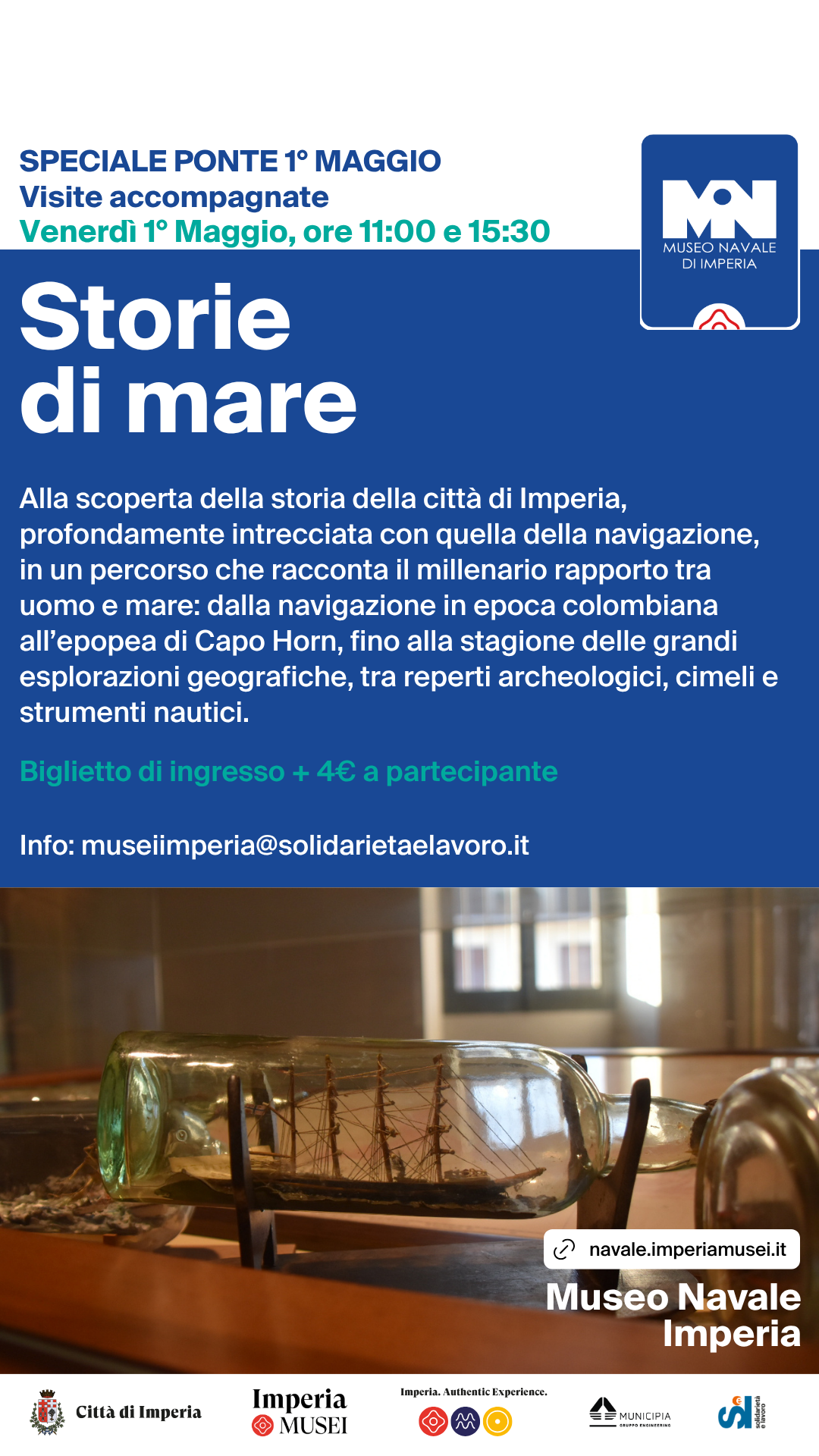 Venerdì 1° Maggio alle ore 11:00 e alle ore 15:30, il Museo Navale propone la visita accompagnata “Storie di mare”: un percorso alla scoperta della storia della città, profondamente intrecciata con la navigazione, che racconta il millenario rapporto tra uomo e mare. Attraversando le sale sui due piani del museo, i partecipanti ripercorreranno la tradizione marinara locale e le pagine di un passato glorioso, dalla navigazione in epoca colombiana all’epopea di Capo Horn, fino alla stagione delle grandi esplorazioni geografiche, in una vera e propria immersione nelle storie di chi ha solcato gli oceani.