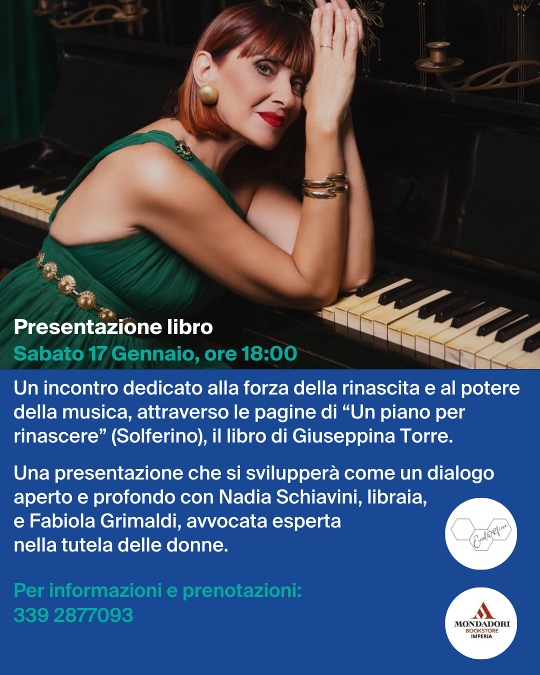 Sabato 17 Gennaio alle ore 18:00 l’Auditorium del Museo Navale di Imperia ospiterà un incontro dedicato alla forza della rinascita e al potere della musica, attraverso le pagine di “Un piano per rinascere” (Solferino), il libro di Giuseppina Torre.